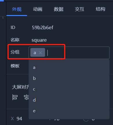 如果画布中的图元较多,建议给每个图元设置一个分组(在外观面板中设置)。 可以使用简单的编号(如 a, b, c, d...)作为分组名称,这样在选择“下一个动画”时,可以直接按照预定的顺序选择分组,操作更加便捷。