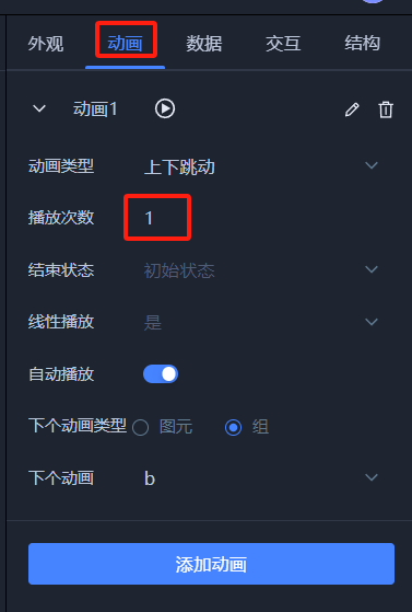 注意:这里的动画播放次数一定要配置为有限个(例如 1 次)。如果配置为无限循环,动画将一直执行,无法触发下一个动画。