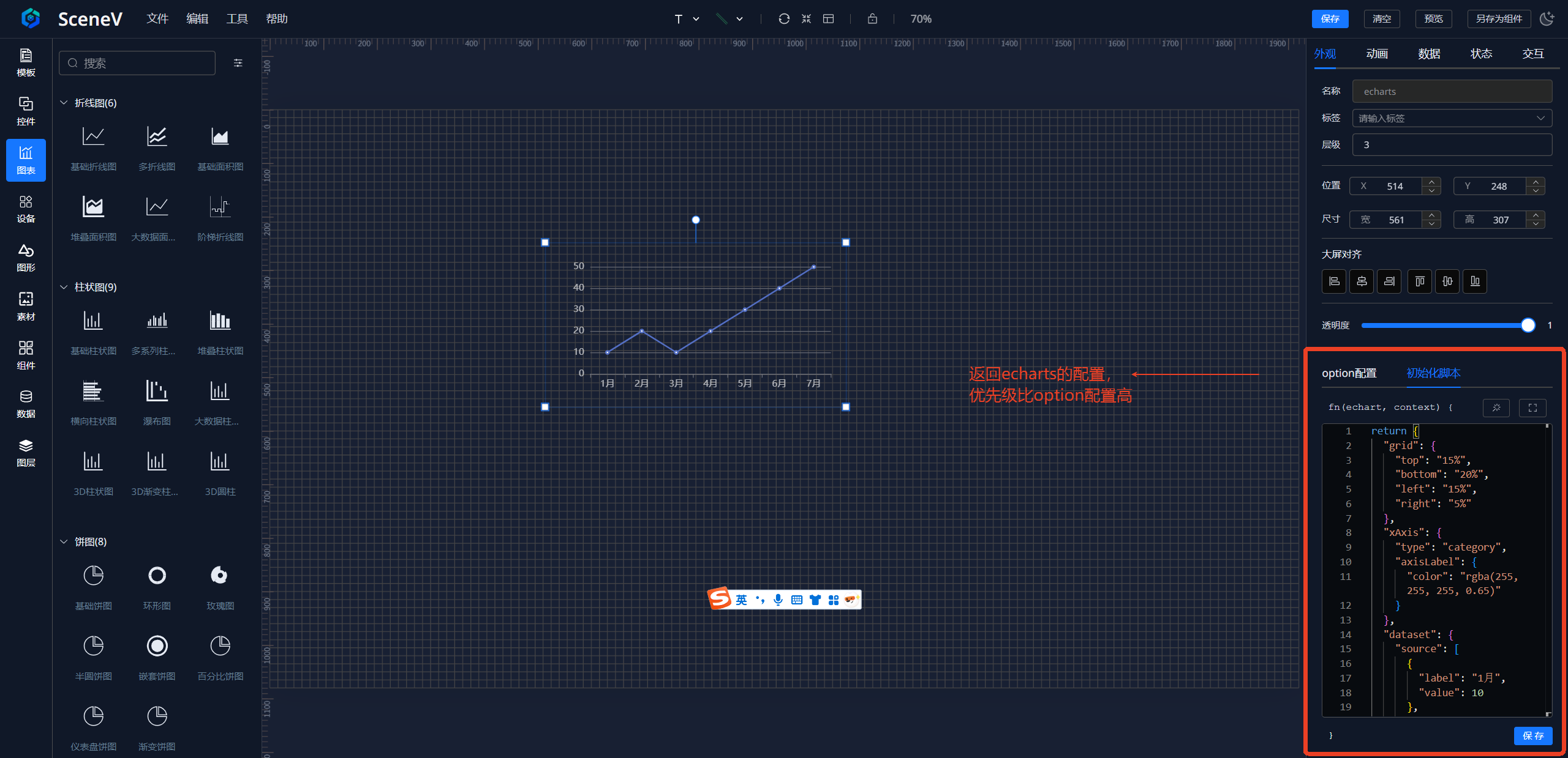 初始化js脚本需返回echarts的option配置。 并且优先级比option配置更高,如果存在初始化脚本,那么option配置就不在生效