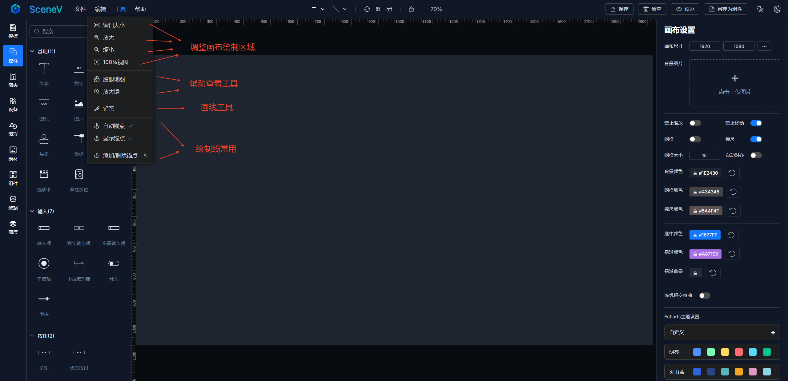 本文档详细介绍了编辑器中提供的各类辅助绘制工具,帮助用户精准控制画布、高效创建图形。