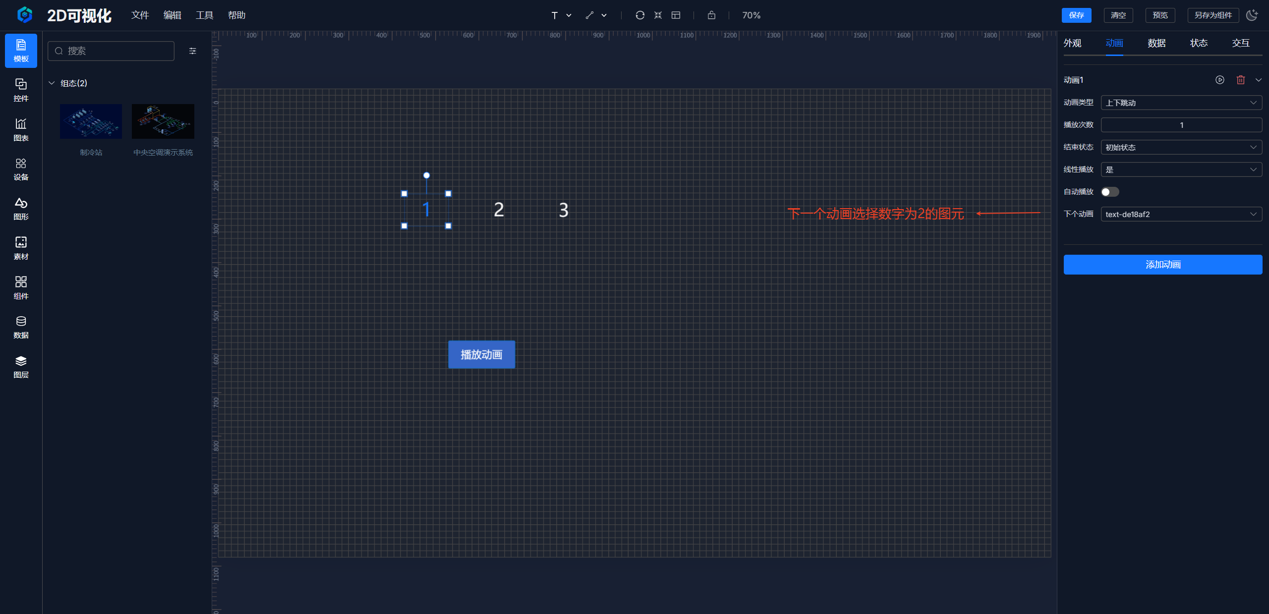 - 图元为1的动画中的下一个动画选择文本为2的图元