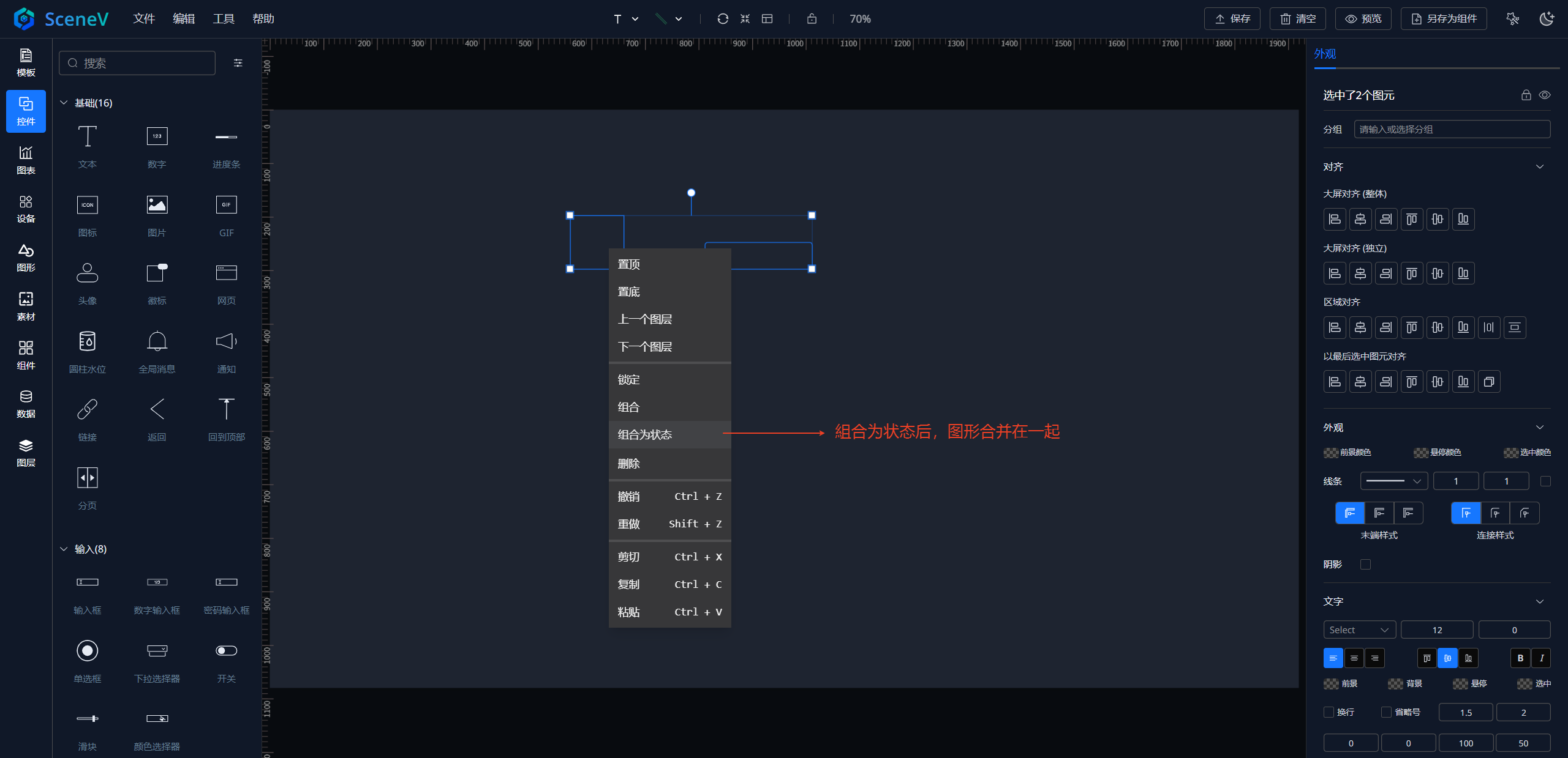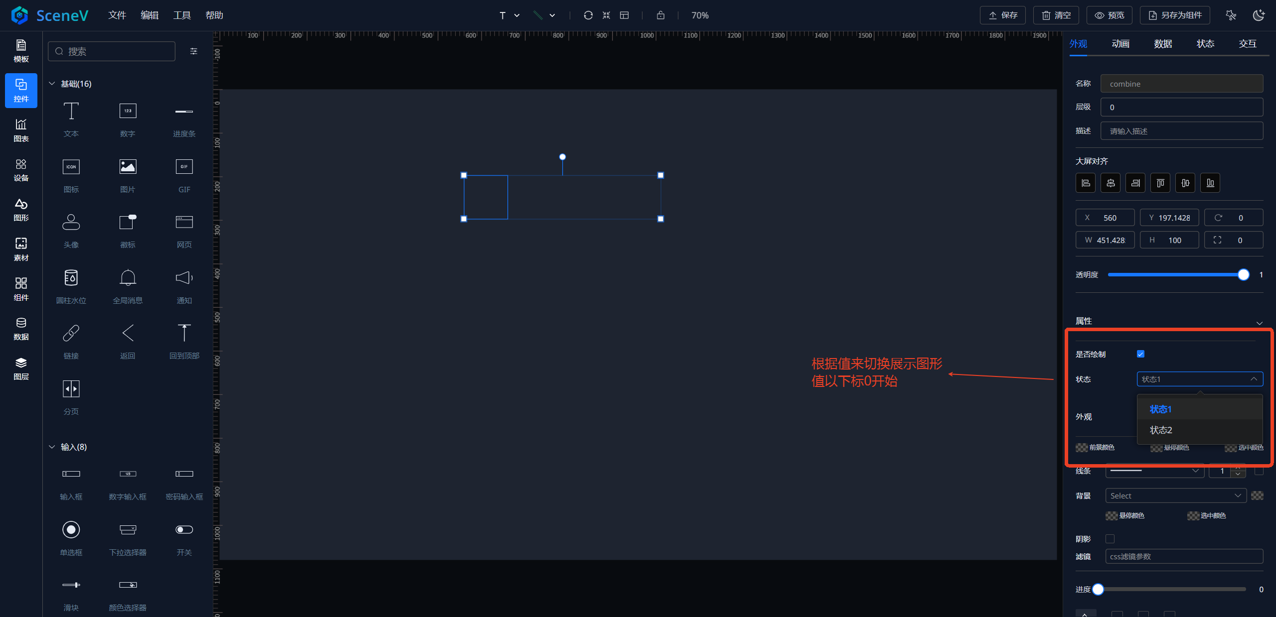 框选多个图元后,可将其组合为一个状态图元。 组合为状态是一种特殊的组合方式,主要用于实现图元状态的切换显示。 组合为状态后,可通过它的值来进行状态切换,例如:设备告警,状态值为1时表示告警,状态值为0时表示正常(状态的值默认以下标区分,从0开始)。