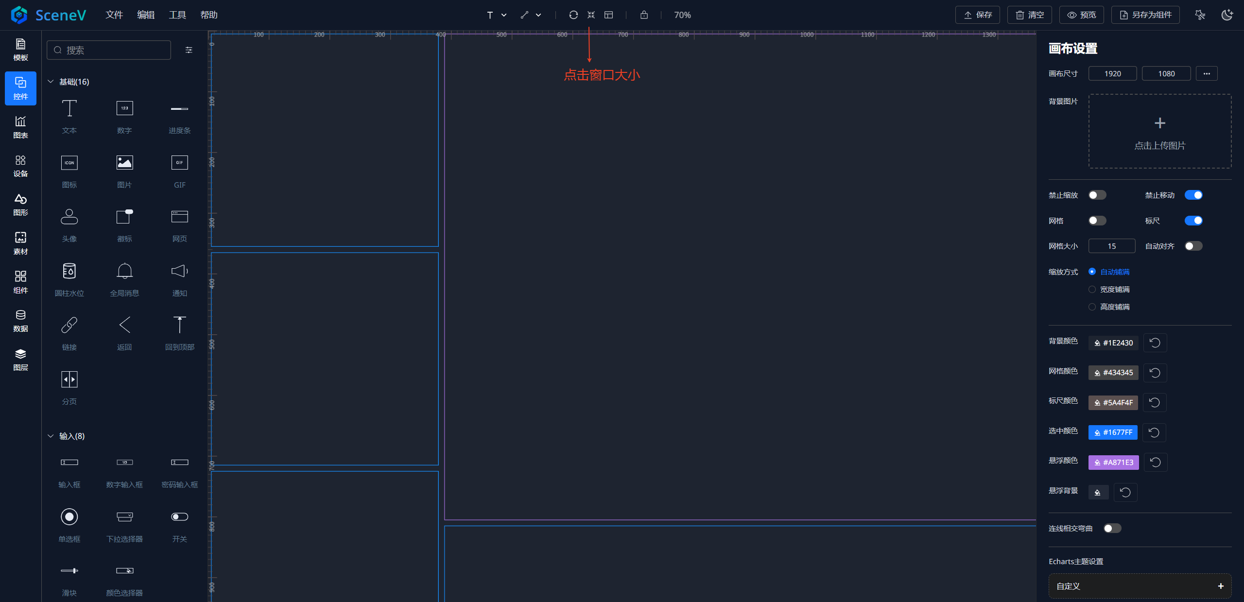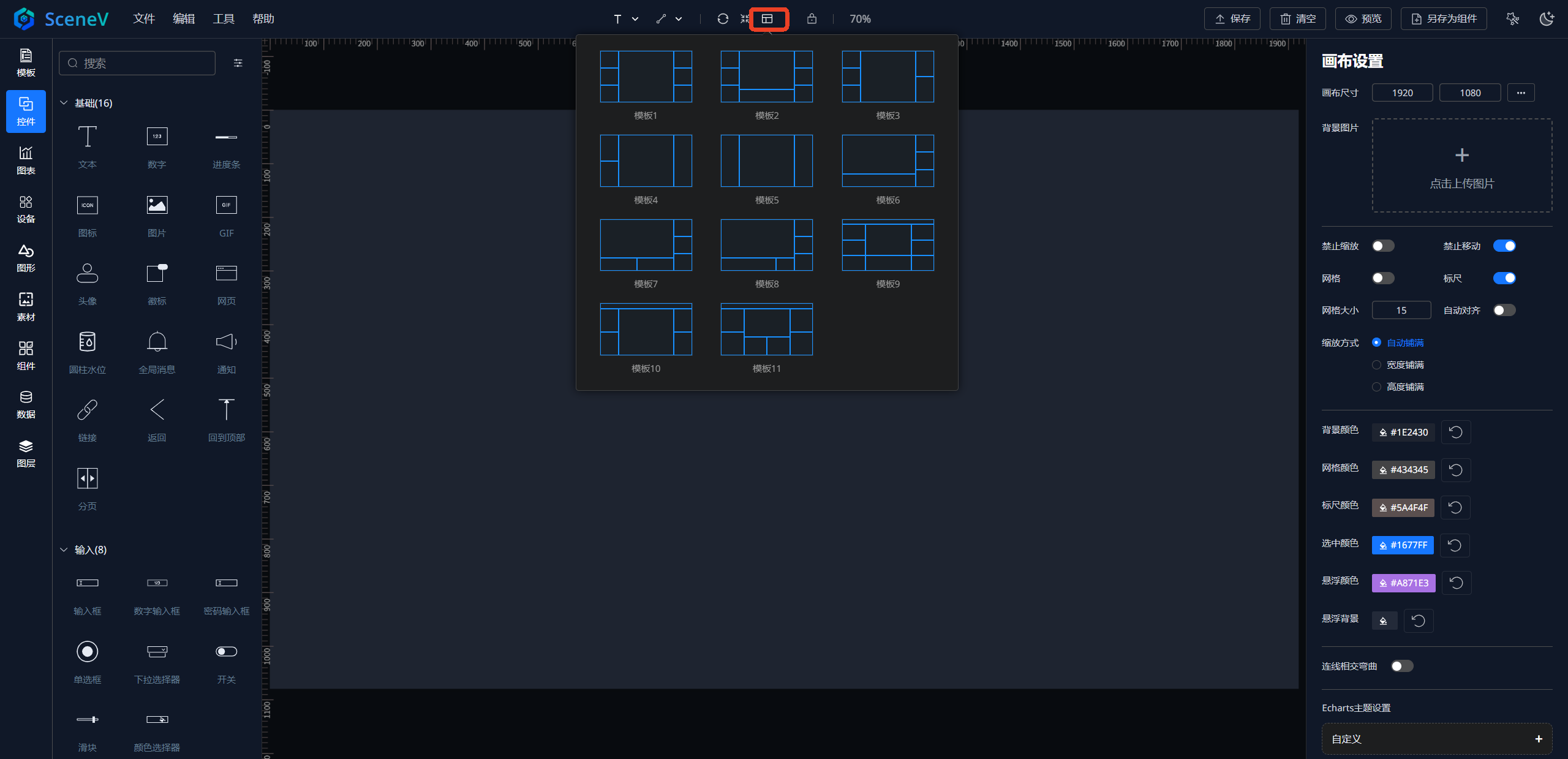 在设计器的顶部中心位置,点击布局的图标,选择对应的页面布局